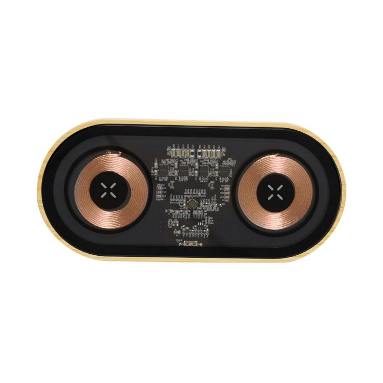 Cargador inalámbrico doble de 15W de original diseño y superficie transparente que permite ver los componentes internos del dispositivo. Con base de bambú, compatible con dispositivos con tecnología Qi, y que además permite cargar dos dispositivos simultáneamente. Conexión Tipo C, con instrucciones de uso en español e inglés. Presentado en caja individual de diseño kraft.Materiales como el bambú fomentan la utilización de materias primas naturales, reduciendo las emisiones contaminantes. Proviene de una planta de gran resistencia y versatilidad, con crecimiento y regeneración rápidos, siendo una excelente alternativa al uso de madera tradicional.Fabricado conforme a los estándares RoHS y en cumplimiento con los siguientes requisitos de seguridad:Sistema de protección contra sobrecalentamiento.Sistema de protección contra sobrecarga.Sistema de bloqueo para evitar cortocircuitos. (color natural)