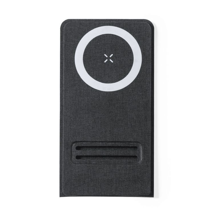 Cargador inalámbrico 15W. Fabricado en resistente poliéster 300D y con fijación magnética para poder usar el dispositivo mientras se produce la carga del mismo e incluyendo anillo adhesivo. Válido para todos los dispositivos con tecnología Magsafe y Qi. Plegado de pequeño tamaño para fácil transporte y presentado en atractiva caja individual de diseño. (color negro)