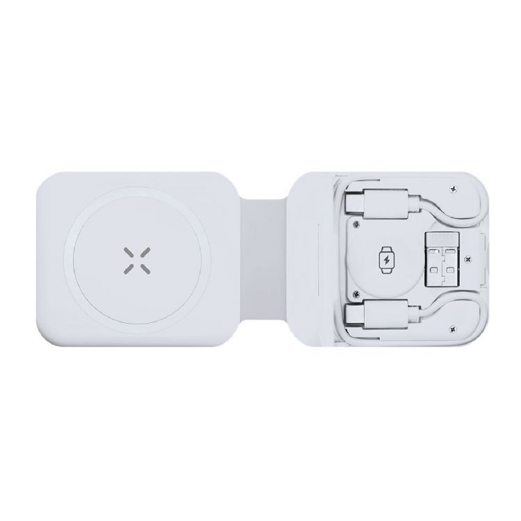 Completo multicargador inalámbrico 15W con soporte para gadgets 3 en 1 plegable. Diseñado para la carga simultánea del smartphone/auriculares y smartwatch: una estación de carga todo en uno. Incluye set de cables Tipo C y adaptador USB, aptos para la transferencia de datos. (color blanco)