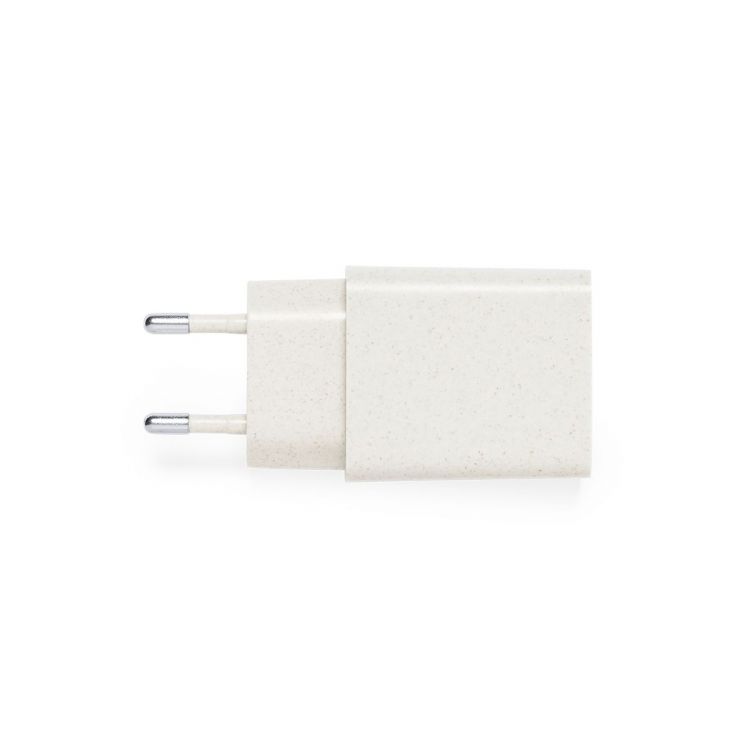 Cargador USB de pared con carga rápida, fabricado en fibra de trigo. Salida USB y Tipo C. Enchufe europeo y presentado en atractiva caja individual de diseño kraft.La caña de trigo fomenta la utilización de materias primas naturales, reduciendo así las emisiones contaminantes. (color natural)