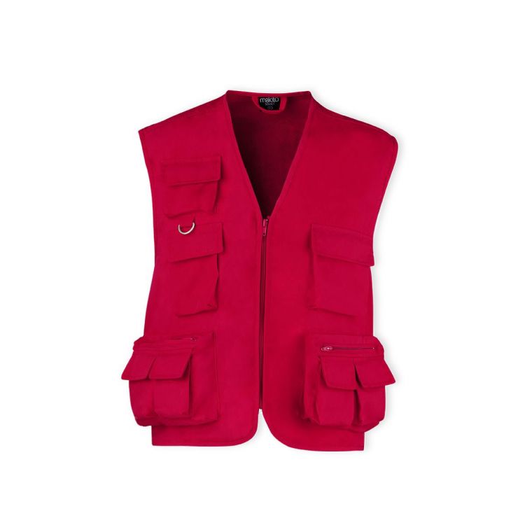 Chaleco en resistente combinación de materiales algodón y poliéster de vivos colores. Cierre de cremallera principal, multitud de bolsillos frontales y laterales de gran capacidad con cierre de velcro y anilla metálica en el pecho. Disponible en tallas L, XL, XXL.