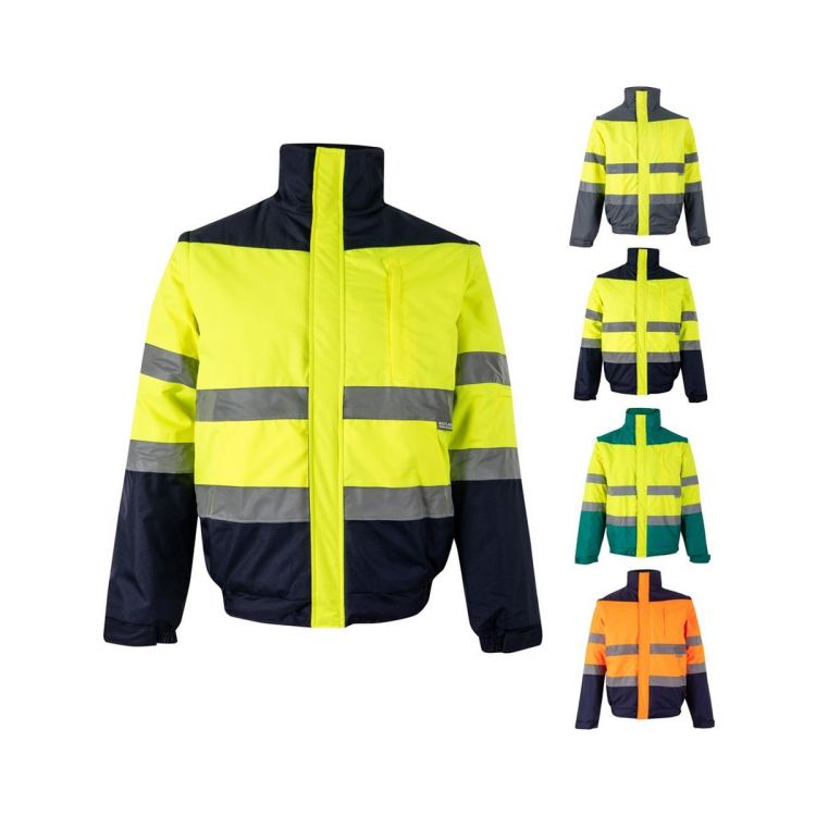 Chaqueta acolchada bicolor (180 g/m²) de poliéster (100 %), con revestimiento de PU. Con cierre de cremallera, oculto por una tapeta, que se cierra con velcro. Cintura y puños con elástico en los laterales. Con bandas reflectantes en el torso y las mangas. Capucha oculta en el interior del cuello y mangas desmontables. Contiene cinco bolsillos (1 bolsillo en el pecho, 2 bolsillos delanteros, 1 bolsillo en el brazo izquierdo y 1 bolsillo interior). Producto conforme al Reglamento UE 2016/425, certificado por EN20471 y clase Nº 2. Tamaño: S, M, L, XL, 2XL, 3XL