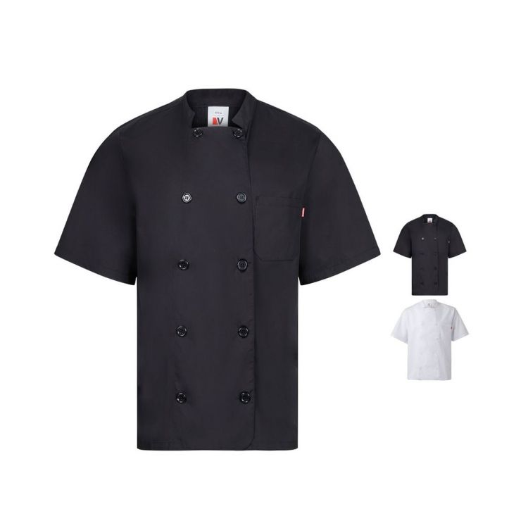 Chaqueta de cocina de manga corta en popelina (110 g/m²) de algodón (35%) y poliéster (65%). Cierre con doble botonadura y 1 bolsillo en el pecho. Tamaño: XS, S, M, L, XL, 2XL, 3XL