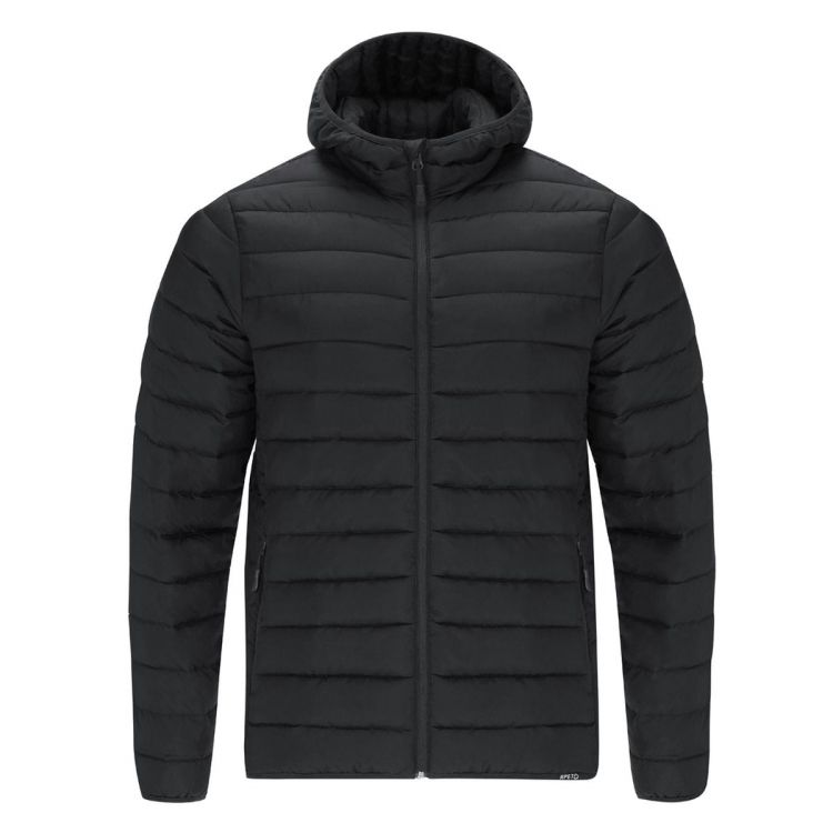 Chaqueta Unisex de RPET con capucha. En material extra ligero con acolchado efecto pluma y suave forro interior, resistente al agua y cortavientos. Puños, cintura y capucha con ribetes elásticos a tono. Apertura con cremallera invertida y tirador a juego, con protector de barbilla. Cuenta con 2 bolsillos exteriores laterales con cremalleras y tiradores a juego, y 2 bolsillos interiores. Etiqueta con distintivo RPET en el ribete de la prenda y práctica funda de transporte con cordón ajustable.