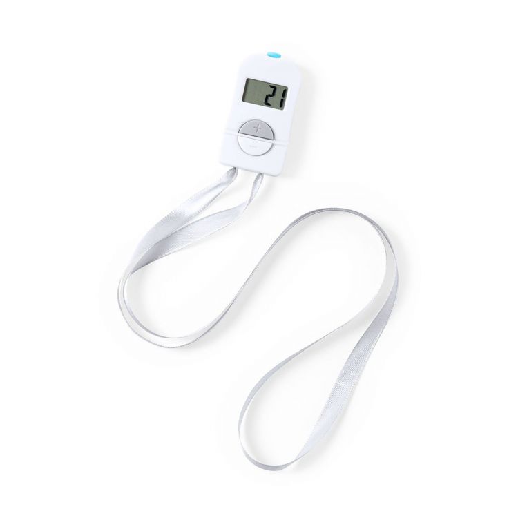 Contador de aforo digital fabricado en resistente material ABS de acabado brillo, con práctica cinta de poliéster y amplios pulsadores para añadir o restar aforo. Pantalla digital con contador de 4 dígitos y botón de reinicio en parte superior. Amplia superficie para logotipo, especialmente diseñado para marcaje en tampografía. Presentado en atractiva caja individual de diseño. Alimentación a pilas, de botón incluida. (color blanco)