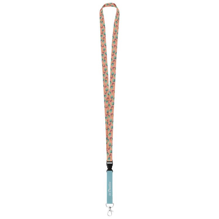 Cordón de poliéster de 15 mm de ancho hecho a medida con mosquetón metálico desmontable. Con gráficos impresos por sublimación en ambas caras. Cantidad mínima: 100 unidades