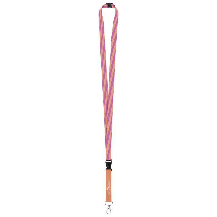 Cordón de poliéster de 15 mm de ancho, hecho a medida, con mosquetón metálico desmontable y hebilla de seguridad. Con gráficos impresos por sublimación en ambas caras. Cantidad mínima: 100 unidades