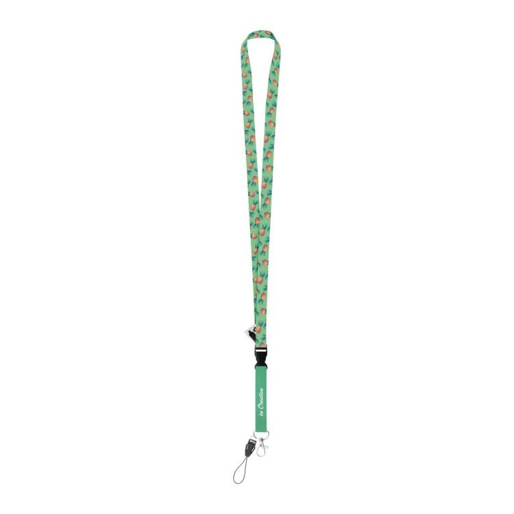 Lanyard RPET de 15 mm de ancho, hecho a medida, con mosquetón metálico desmontable y cordón móvil. Con gráficos impresos por sublimación en ambas caras. Cantidad mínima: 100 unidades