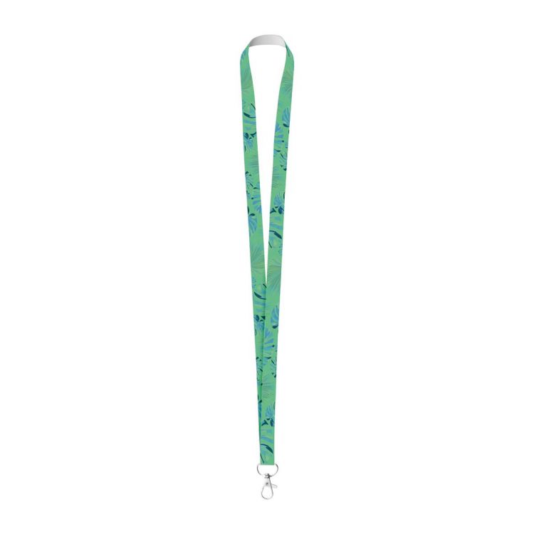 Cordón de poliéster de 15 mm de ancho hecho a medida con mosquetón metálico. Con gráficos impresos por sublimación en una cara. Cantidad mínima: 100 unidades