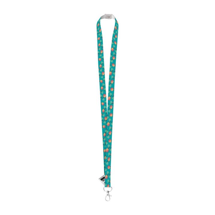 Lanyard RPET personalizado de 15 mm de ancho con mosquetón metálico y hebilla de seguridad de plástico de paja de trigo. Con gráficos impresos por sublimación en una cara. Cantidad mínima: 100 unidades