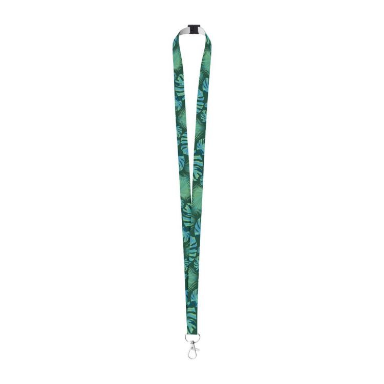 Cordón de poliéster de 15 mm de ancho, hecho a medida, con mosquetón metálico y hebilla de seguridad. Con gráficos impresos por sublimación en una cara. Cantidad mínima: 100 unidades