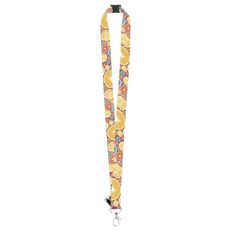 Cordón RPET hecho a medida con mosquetón metálico y hebilla de seguridad. Con gráficos impresos por sublimación en ambas caras. Cantidad mínima: 100 unidades