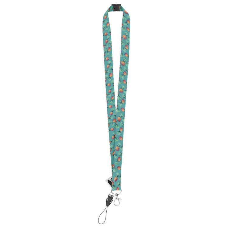 Cordón RPET hecho a medida con mosquetón metálico, cordón móvil y hebilla de seguridad. Con gráficos impresos por sublimación en ambas caras. Cantidad mínima: 100 unidades
