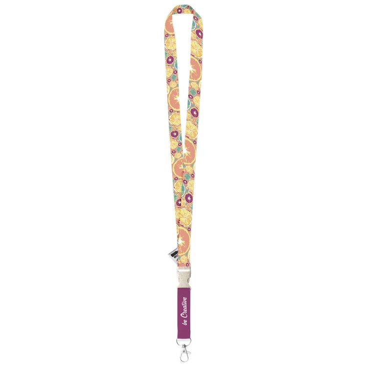 Cordón RPET hecho a medida con mosquetón metálico desmontable y hebilla de plástico de paja de trigo. Con gráficos impresos por sublimación en ambas caras. Cantidad mínima: 100 unidades