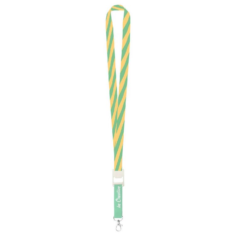 Cordón de poliéster hecho a medida con mosquetón metálico y abrebotellas. Con gráficos impresos por sublimación en ambas caras. Cantidad mínima: 100 unidades