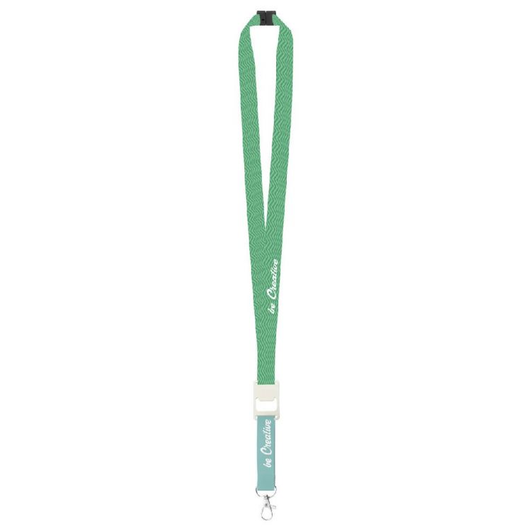 Cordón de poliéster hecho a medida con mosquetón metálico, abrebotellas y hebilla de seguridad. Con gráficos impresos por sublimación en ambas caras. Cantidad mínima: 100 unidades
