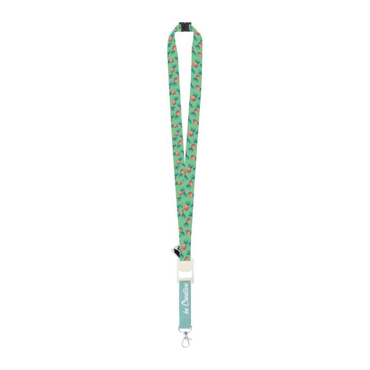 Cordón RPET hecho a medida con mosquetón metálico, abrebotellas y hebilla de seguridad. Con gráficos impresos por sublimación en ambas caras. Cantidad mínima: 100 unidades
