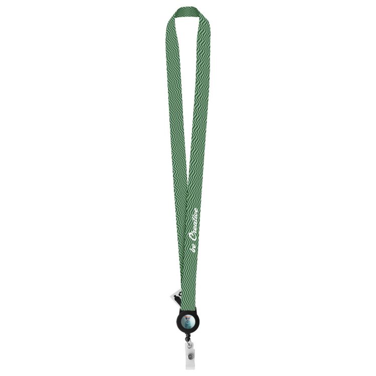 Cordón RPET a medida con portacredenciales telescópico. Con gráficos impresos por sublimación en ambas caras. Cantidad mínima: 100 unidades