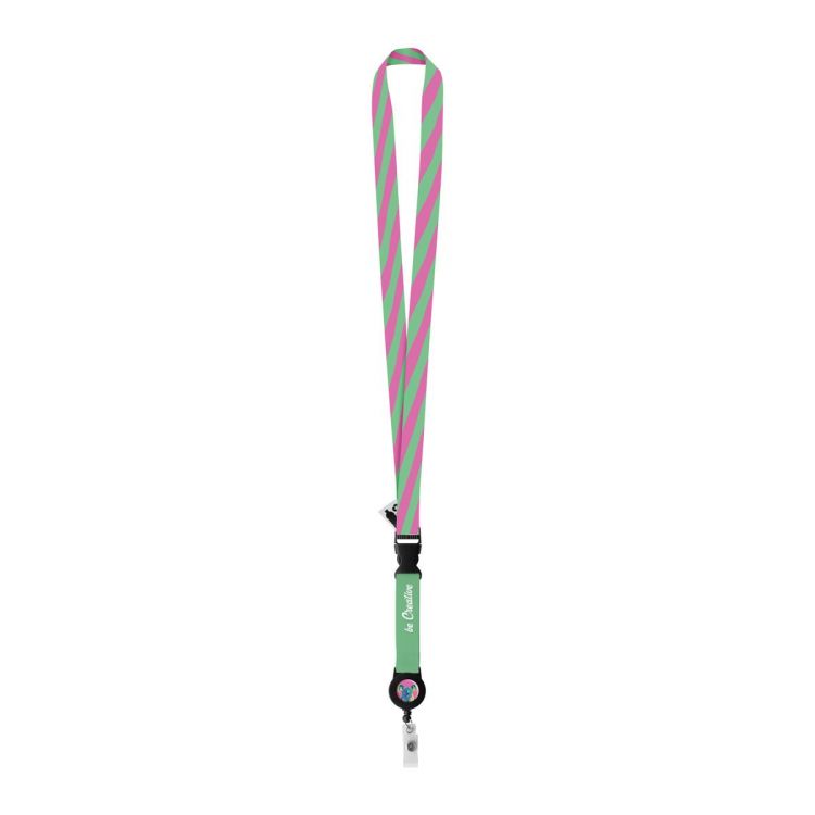 Lanyard RPET ancho hecho a medida con portacredenciales telescópico desmontable. Con gráficos impresos por sublimación en ambas caras. Cantidad mínima: 100 unidades