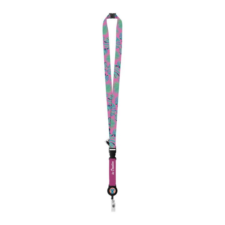 Cordón RPET hecho a medida con portacredenciales telescópico desmontable y hebilla de seguridad. Con gráficos impresos por sublimación en ambas caras. Cantidad mínima: 100 unidades