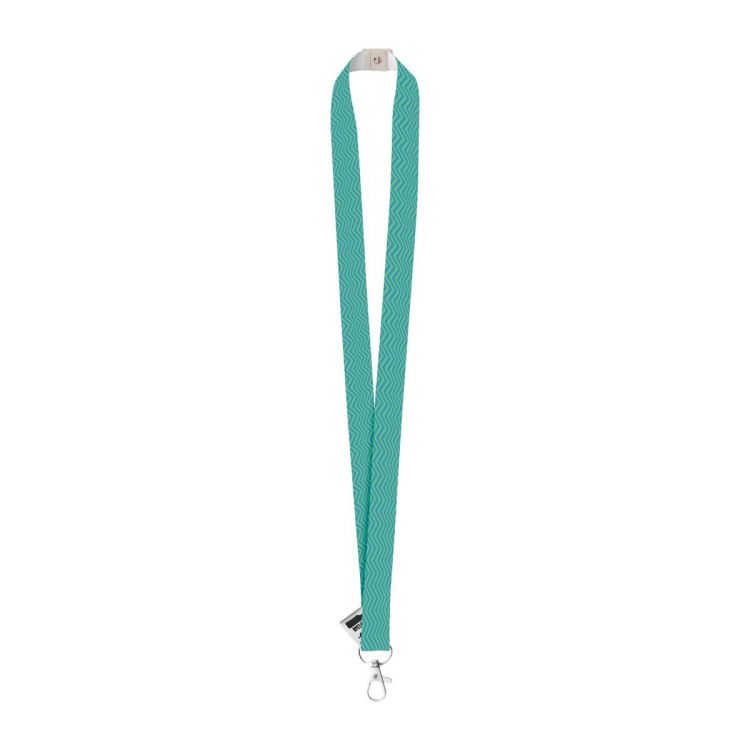 Cordón RPET hecho a medida con mosquetón metálico y hebilla de seguridad de plástico de paja de trigo. Con gráficos impresos por sublimación en una cara. Cantidad mínima: 100 unidades