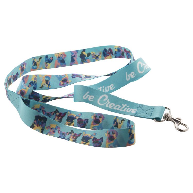 Correa de poliéster a medida con mosquetón metálico. Con gráficos impresos por sublimación en ambas caras. Cantidad mínima: 50 unidades