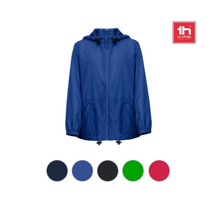 Cortavientos impermeable para niños (Unisex) en tejido de tafetán de nailon 100% reciclado (65 g/m²). Apertura frontal con cremallera YKK®: una marca que utiliza equipos modernos y control de alta calidad. La capucha está forrada con malla y tiene cordones para ajustar. Dispone de ojales para facilitar la ventilación, cierre elástico con topes en el bajo y bolsillos laterales con cremallera. Tamaños: 4, 6, 8, 10, 12