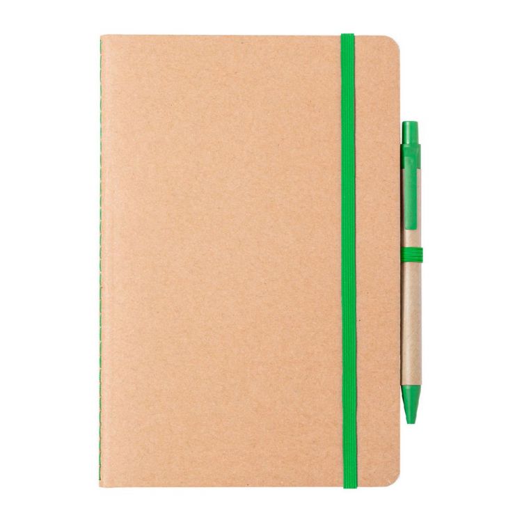 Cuaderno forrado de cartón reciclado con 60 hojas en blanco y correa de goma de color, tamaño A5. Incluye bolígrafo de plástico de paja de trigo con recarga azul.