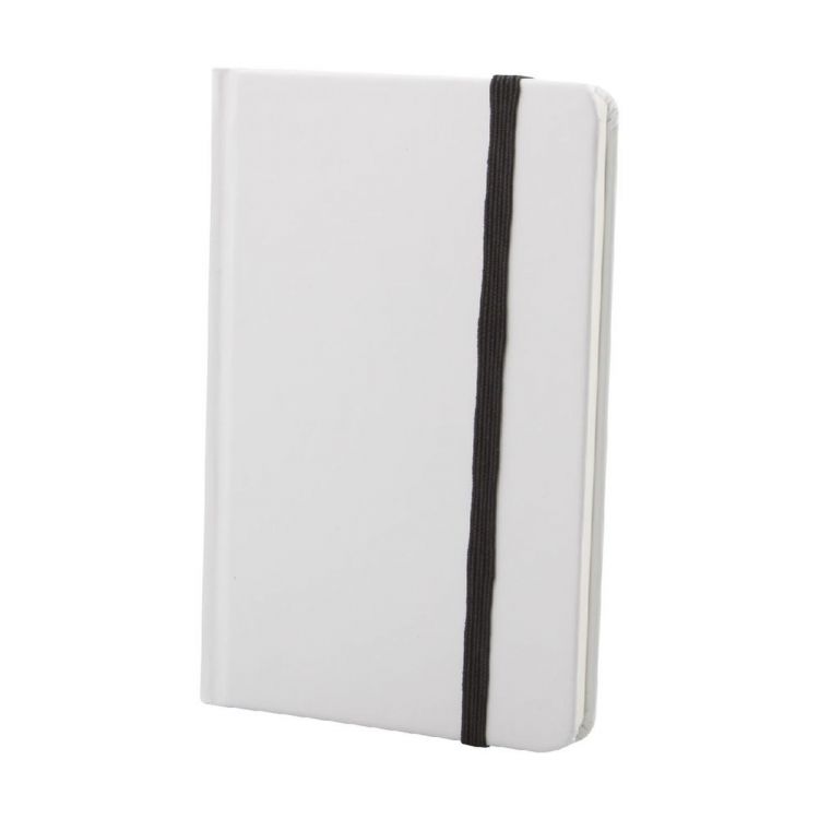 Cuaderno blanco forrado de cartón con 80 hojas en blanco y banda de goma de color. Tamaño A6.