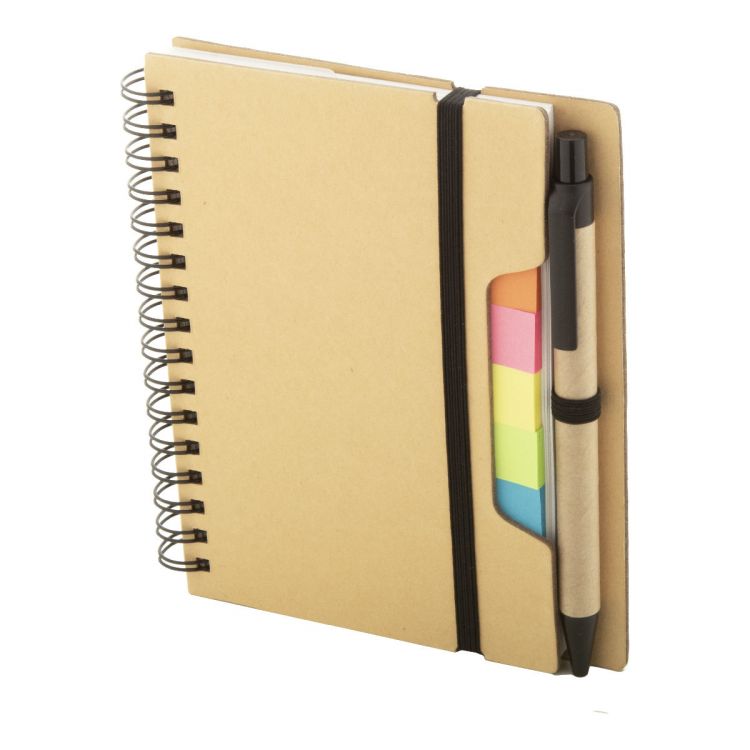 Cuaderno de espiral de papel reciclado con 70 hojas rayadas y 125 marcadores de página (en 5 colores diferentes). Con correa de goma y portabolígrafos. Tamaño A6. Incluye bolígrafo de papel reciclado con recarga azul.