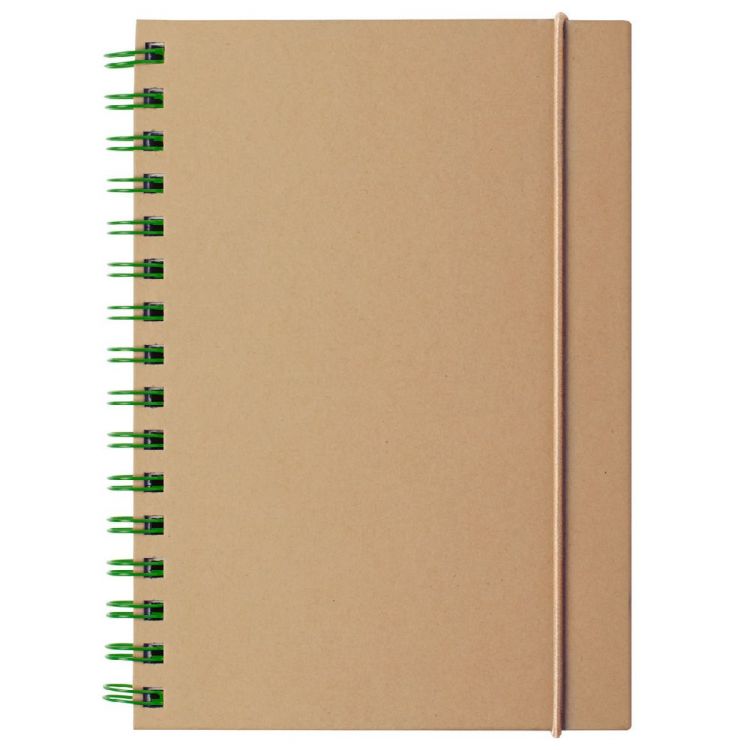 Cuaderno de espiral forrado de cartón reciclado con correa de caucho. 80 hojas rayadas, tamaño A5.