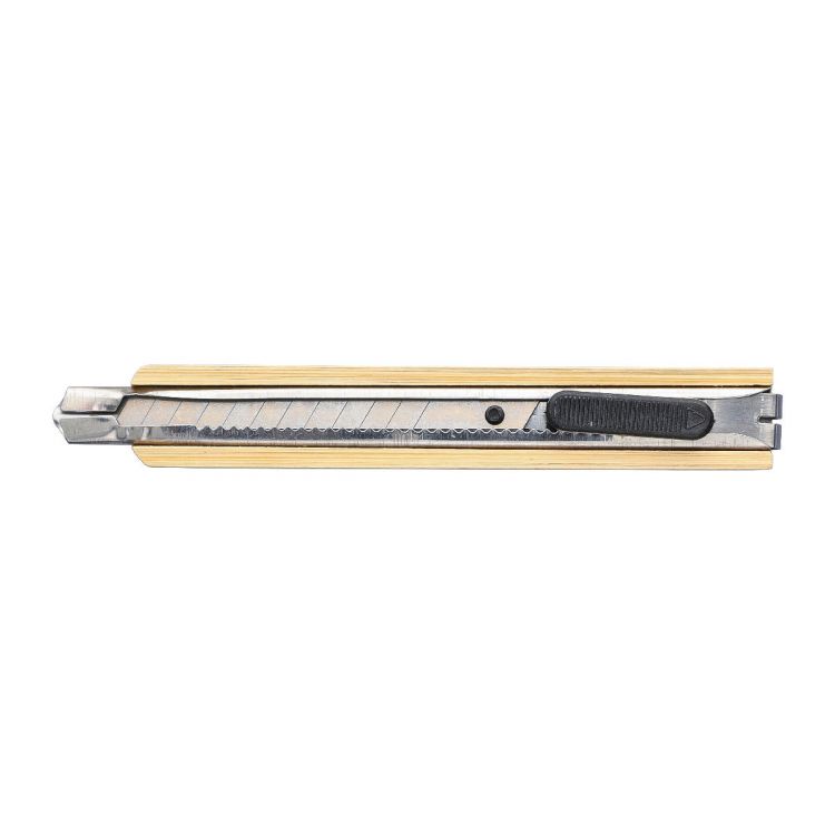 Cúter de metal con cuerpo de bambú. Cuenta con un clip de metal en la parte posterior para sujetarlo cuando no esté en uso. Las hojas están hechas de acero al carbono. Presentado en una bolsa de plástico reciclada.
