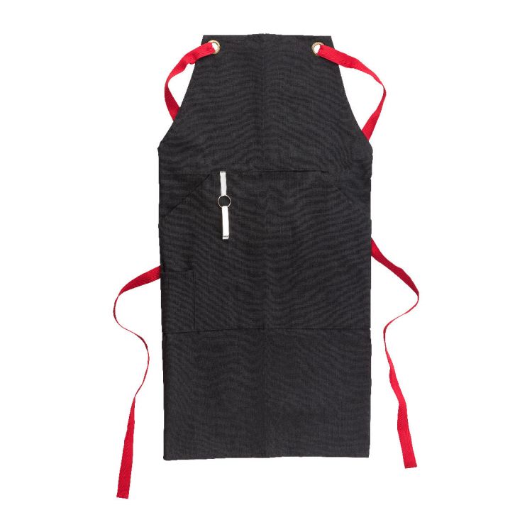 Delantal de algodón y poliéster con cintas coloreadas para atar en varias posiciones. En el bolsillo frontal tiene un abrebotellas.