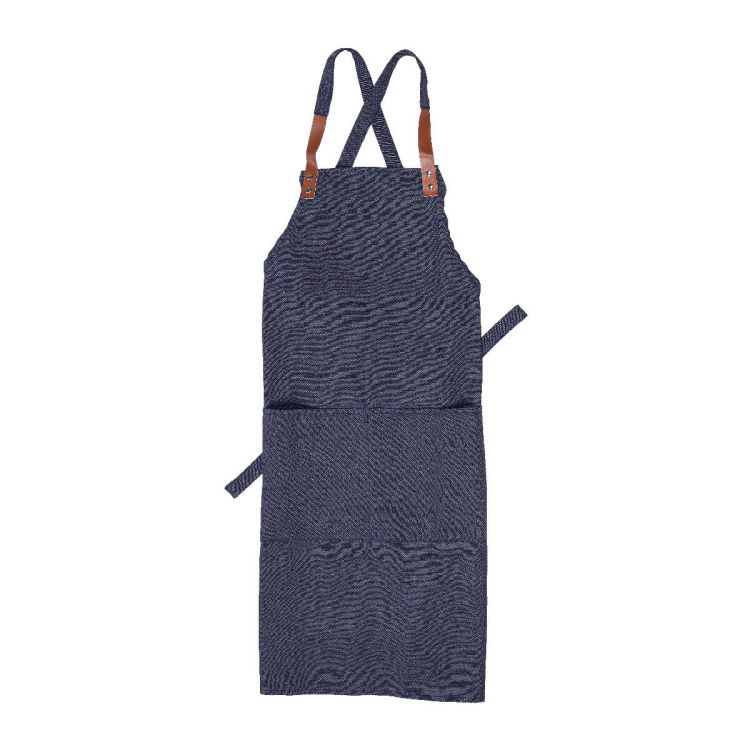 Delantal de mezclilla 65 % poliéster y 35 % algodón (280 g/m2) con tirantes y dos bolsillos delanteros. Se ajusta a los hombros mediante las correas. Presentado en una caja de regalo de cartón marrón.