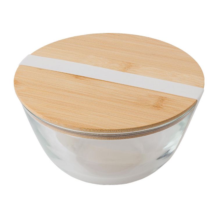 Ensaladera de cristal con tapa de bambú y cierre de silicona. Capacidad 1200 ml. Vidrio especial reforzado (borosilicato), fino pero resistente. Presentada en una caja de cartón marrón.