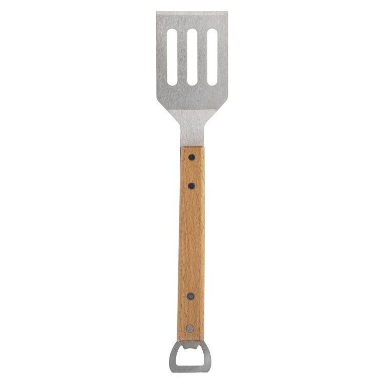 Espátula para barbacoa de acero inoxidable con mango de madera y abrebotellas