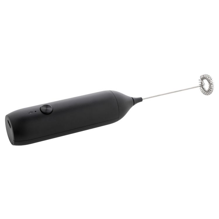 Espumador de leche eléctrico de mano con carcasa de ABS reciclado y acabado mate. Con batería recargable USB integrada (500 mAh). Incluye cable de carga USB-C, de color negro