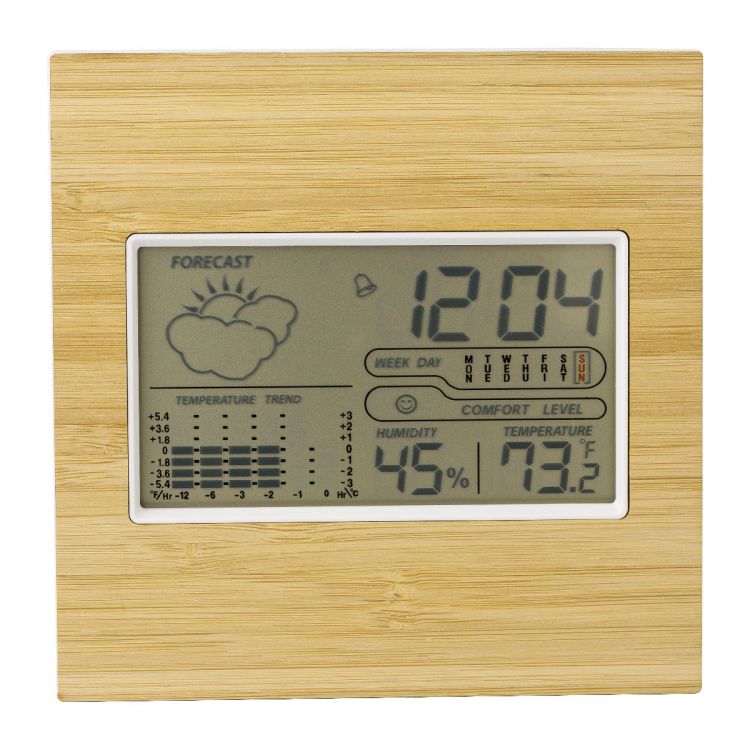 Estación meteorológica de bambú, ABS y vidrio con soporte plegable que se bloquea en varias posiciones. Funciones: hora, calendario, resumen de la semana, alarma y repetición, temperatura, humedad e información meteorológica. Pilas incluidas.