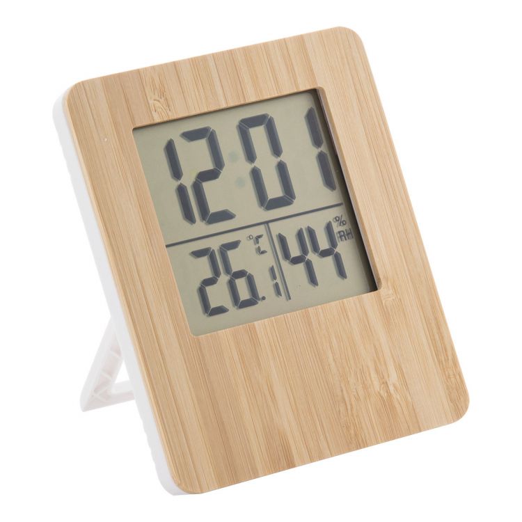 Estación meteorológica y reloj digital con panel frontal de bambú. Funciones: despertador, calendario, termómetro e indicador de humedad. Funciona con 2 pilas AAA, sin batería