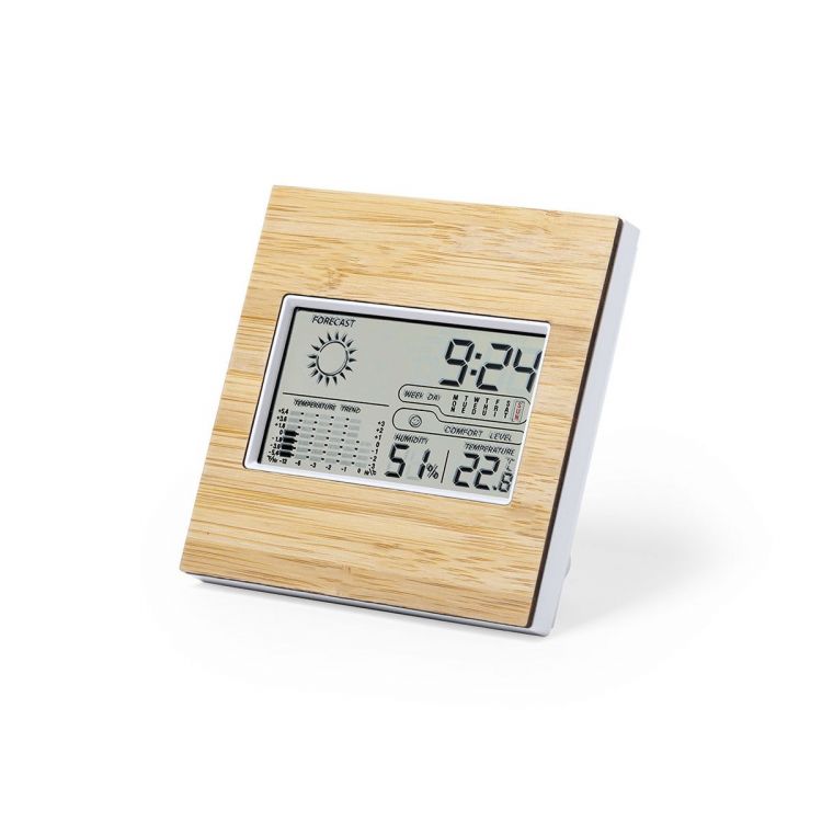 Estación meteorológica de línea nature con frontal en bambú. Con sensor de temperatura y humedad. Función calendario y alarma. Soporte trasero abatible y ajustable, con posibilidad de instalación en la pared. Alimentación a pilas (2xAAA no incluidas) y presentado en atractiva caja de diseño eco. Disponible manual de instrucciones en español e inglés. (color natural)
