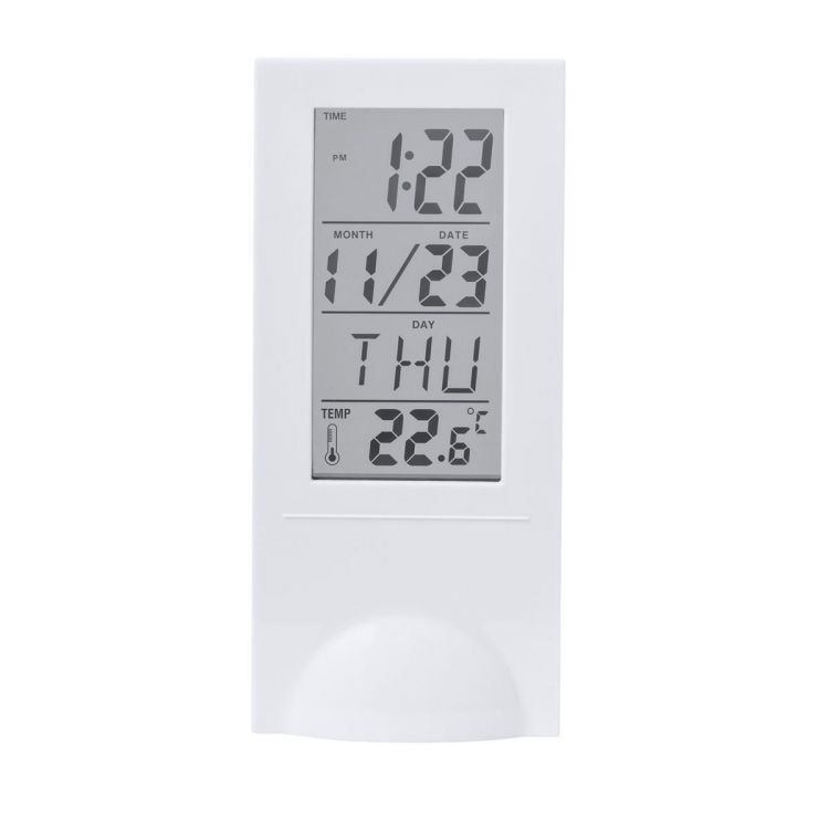Estación meteorológica fabricada en resistente ABS, con sensor de temperatura. Función de hora (12/24), calendario, alarma y día de la semana. Con base soporte y botones de control traseros. Alimentación a pilas (2xAAA no incluidas) y presentada en atractiva caja de diseño kraft. Disponible manual de instrucciones en español e inglés. (color blanco)