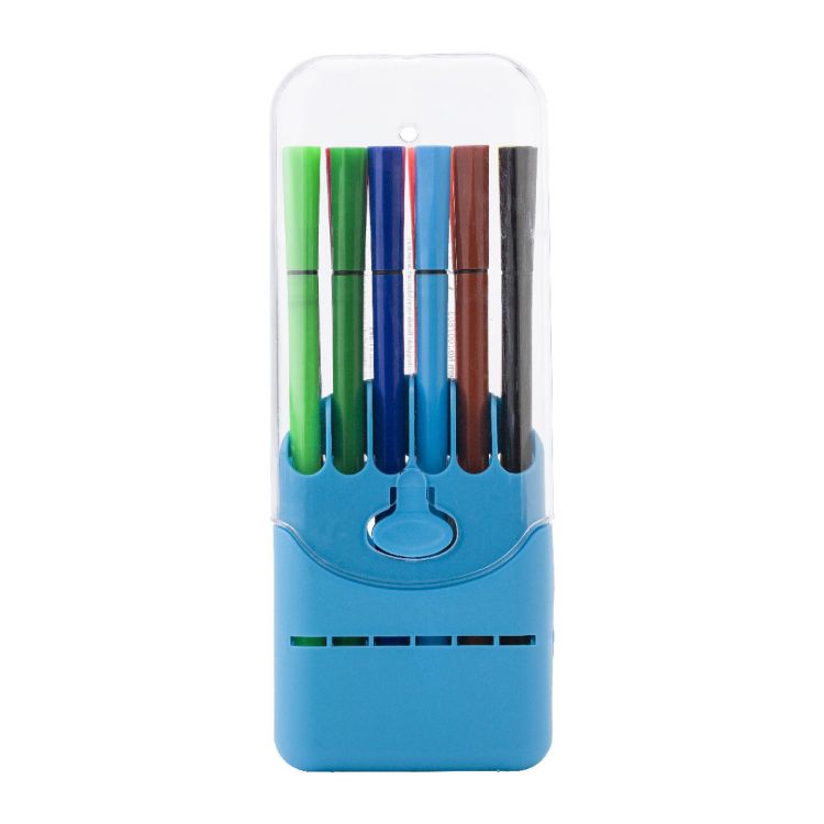 Estuche de plástico con 12 rotuladores, con tinta al agua, en diferentes colores.