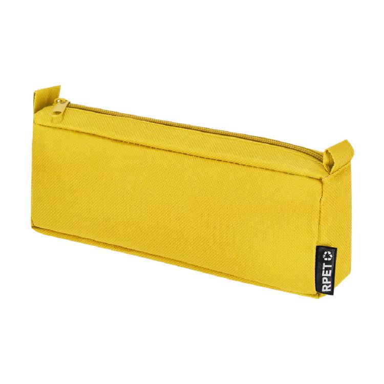 Estuche rectangular confeccionado en poliéster 600D RPET. Cuenta con cremallera a juego y cintas tiradoras en los laterales. Incluye distintivo RPET.