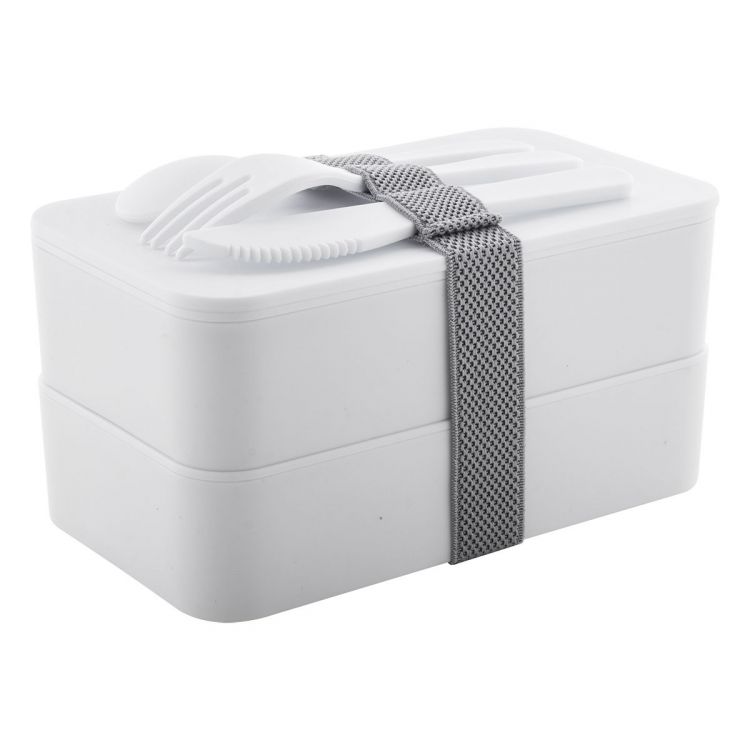 Fiambrera de plástico antibacteriano con juego de cubiertos (tenedor, cuchara y cuchillo) y correa elástica. Con 2 compartimentos de 700 ml de capacidad cada uno. Cumple la norma ISO 22196, de color blanco