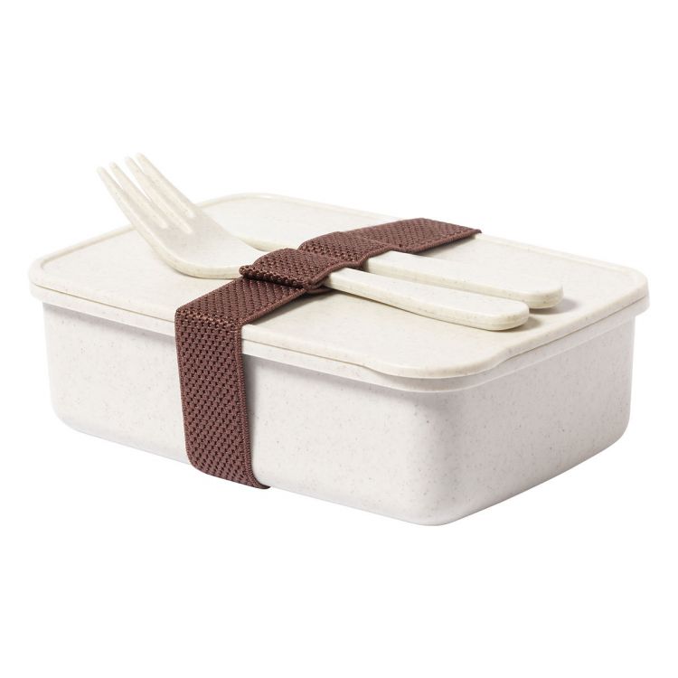 Fiambrera de plástico PP con juego de cubiertos (cuchillo y tenedor) y cinta elástica. 700 ml, de color natural