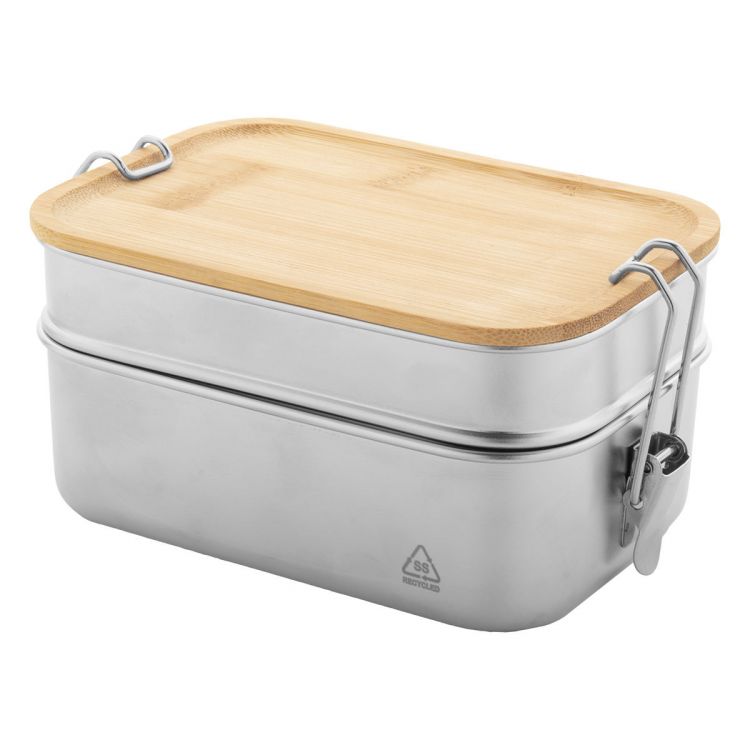 Fiambrera de acero inoxidable reciclado con tapa de bambú y cierre seguro de hebilla. Con 2 compartimentos de 340 y 600 ml de capacidad