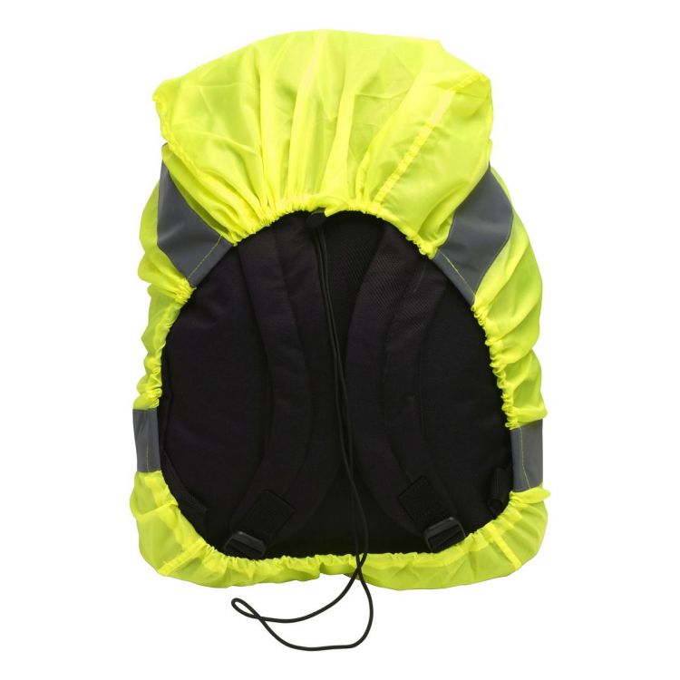Funda de mochila de poliéster (190T), de alta visibilidad. Elástica para su completa adaptación y con dos bandas reflectantes. Para uso promocional.