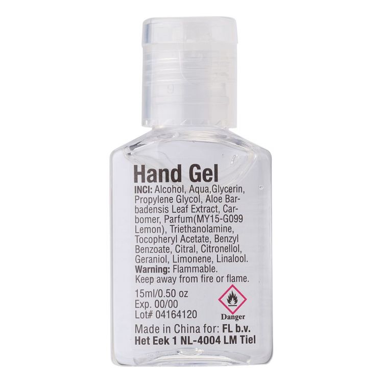 Botella de PET (15 ml.) con gel para las manos un 62% de alcohol, sin etanol.