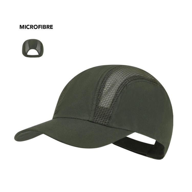 Gorra deportiva en suave microfibra de diseño. Ajustable cierre de velcro y paneles de redecilla transpirables.
