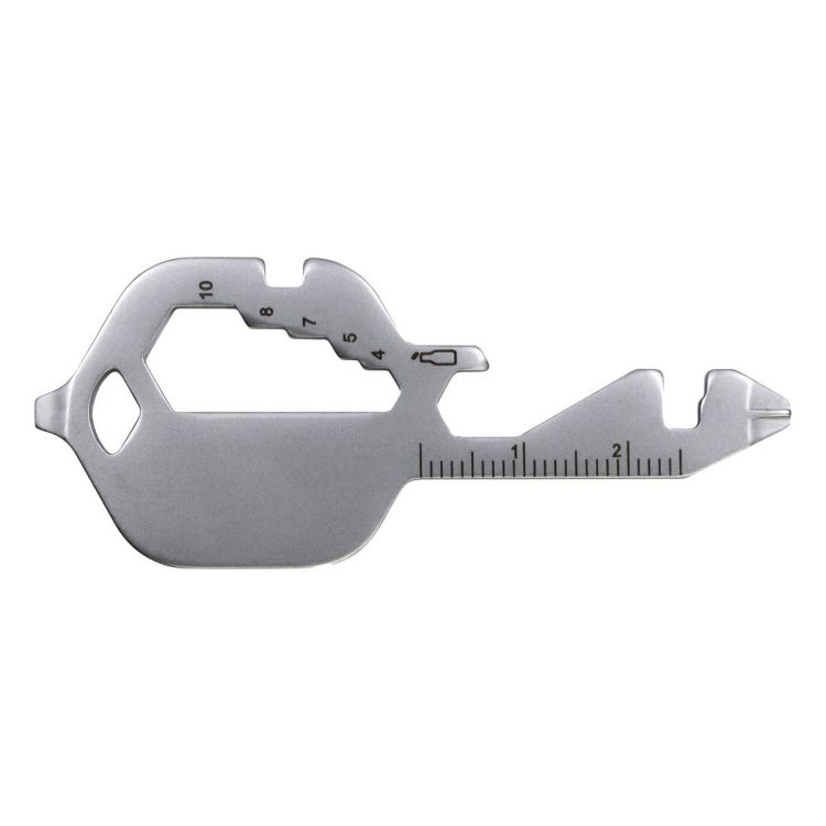 La multiherramienta Kee, fabricada en acero inoxidable martensítico 2CR13 duradero, combina 12 herramientas esenciales en un diseño compacto con forma de llave para colocarla fácilmente en cualquier llavero. Incluye una llave para radios de bicicleta, llaves (tamaños de 4 a 10 mm), abridor de botellas, destornilladores Phillips y de punta plana, doblador de alambre y reglas en centímetros y pulgadas. Presentada en una elegante caja negra, es una herramienta práctica y todo en uno para las necesidades diarias, en color plata